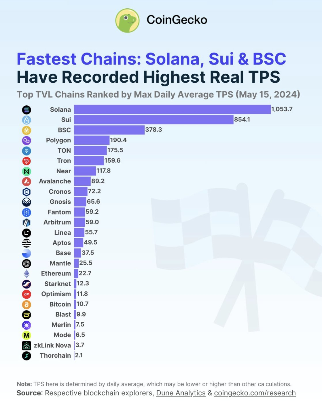 CoinGecko 于 5 月 17 日发布的 《Fastest Chains》报告中显示,Solana 是大型区块链中速度最快的,最高日均真实 TPS 达到 1,054(已经去除了投票交易),Sui 是第二快的区块链,最高日均真实 TPS 达到 854,BSC 排名第三,但达到的真实 TPS 还不到 Sui 的一半。