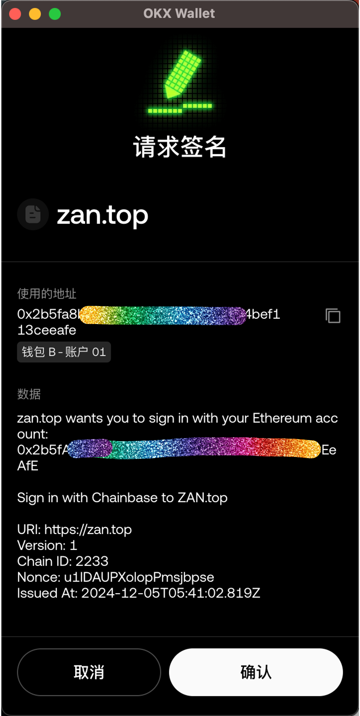 前端在获取到 Nonce 值之后,就需要构建签名内容,SIWE 可以设计的签名内容包括获取到的 Nonce 值、域名、链 ID、签名的内容等,我们一般会使用钱包提供的签名方法来对内容进行签名。