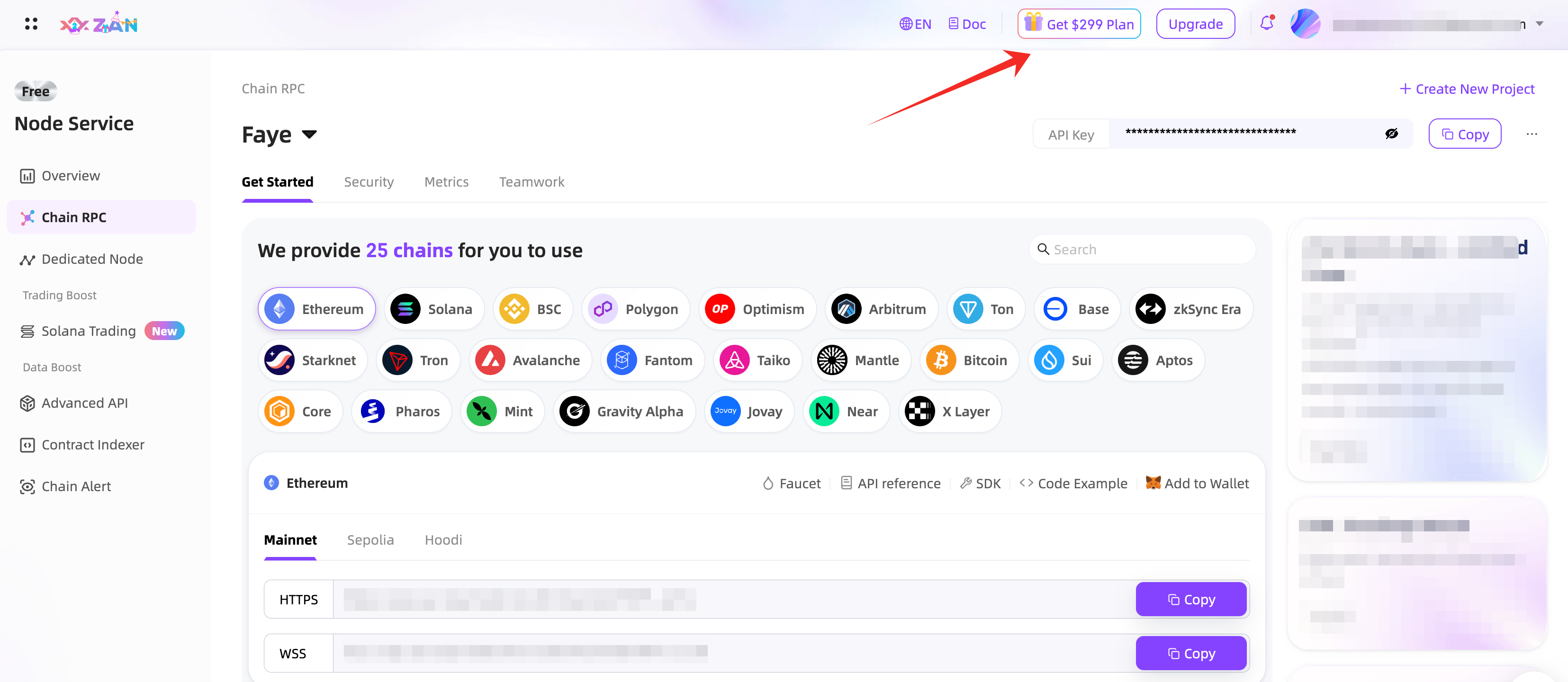 步骤 3:在 ZAN Node 控制台或我的个人资料中,点击“Get $299 Plan”以访问活动页面。