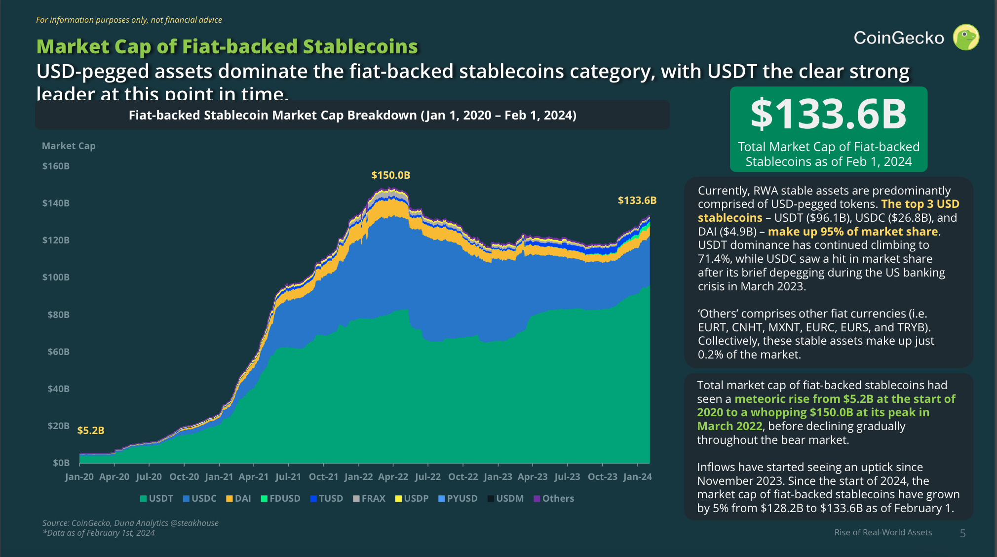 CoinGecko发布2024年现实世界资产(RWA)报告显示,稳定币占据RWA市场主导,前三大美元稳定币市值占比95%。USDT以71.4%的份额领跑,而USDC自银行业危机后市场份额急剧下滑。其他法币挂钩资产占比仅1%,稳定资产总市值在熊市中下滑后于2024年初实现4.9%增长。