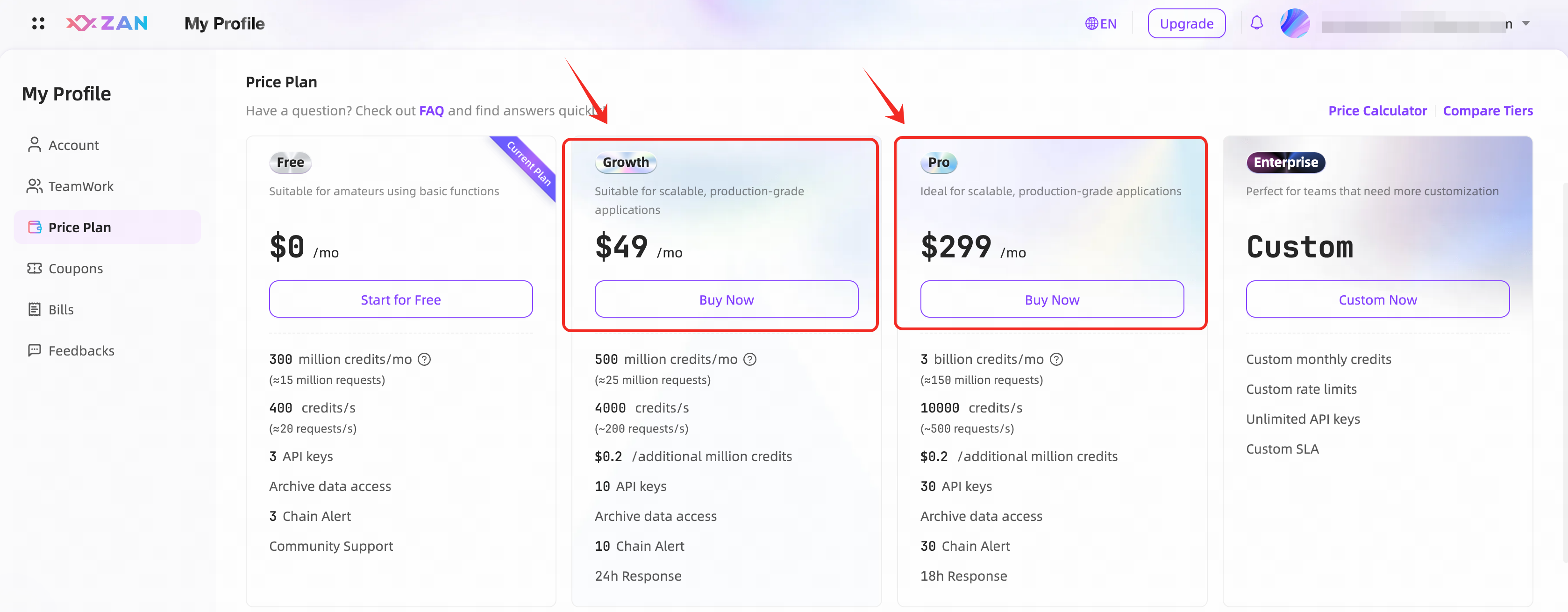 步驟 5:新用戶通過您的推薦鏈接在 ZAN 上注冊並使用 ZAN Node Service,完成昇級套餐至 Growth 版本或 Pro 版本。