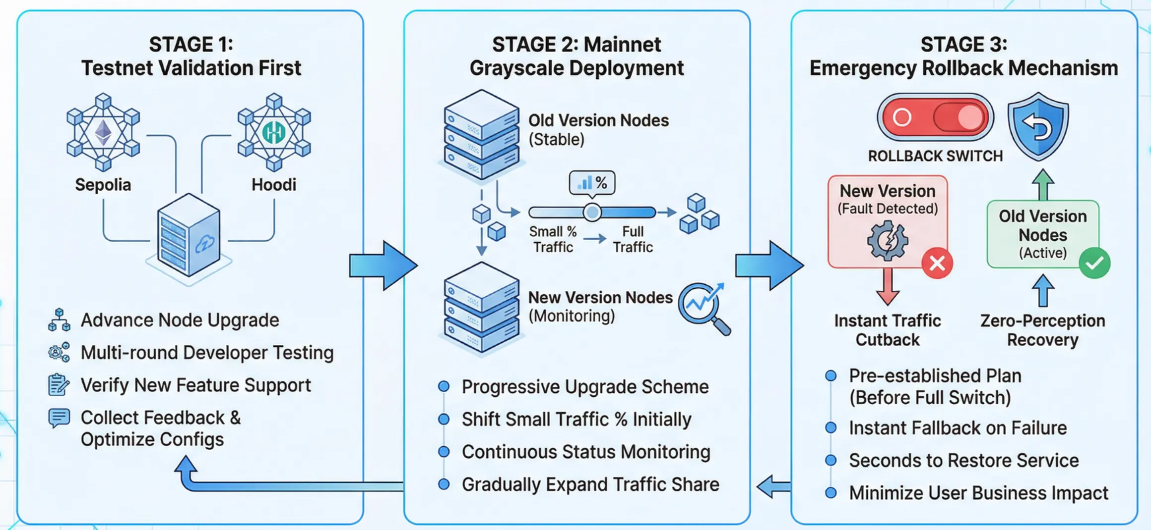 - 主網灰度部署:主網升級窗口期,採用漸進式升級方案——先將小比例用戶流量切換至新版節點,持續監控運行狀態;待各項指標穩定後,再逐步擴大流量佔比,直至全量切換。