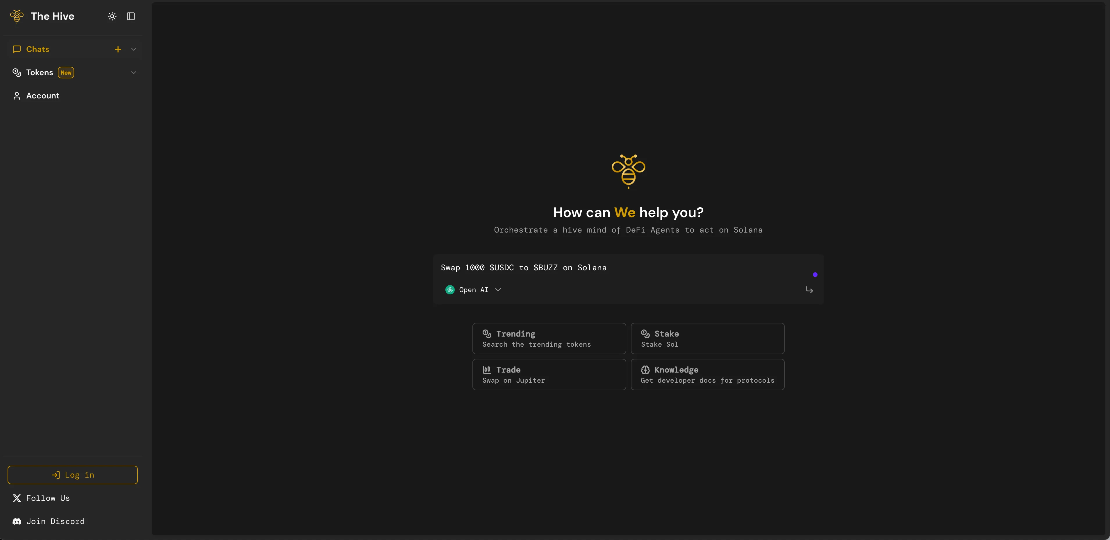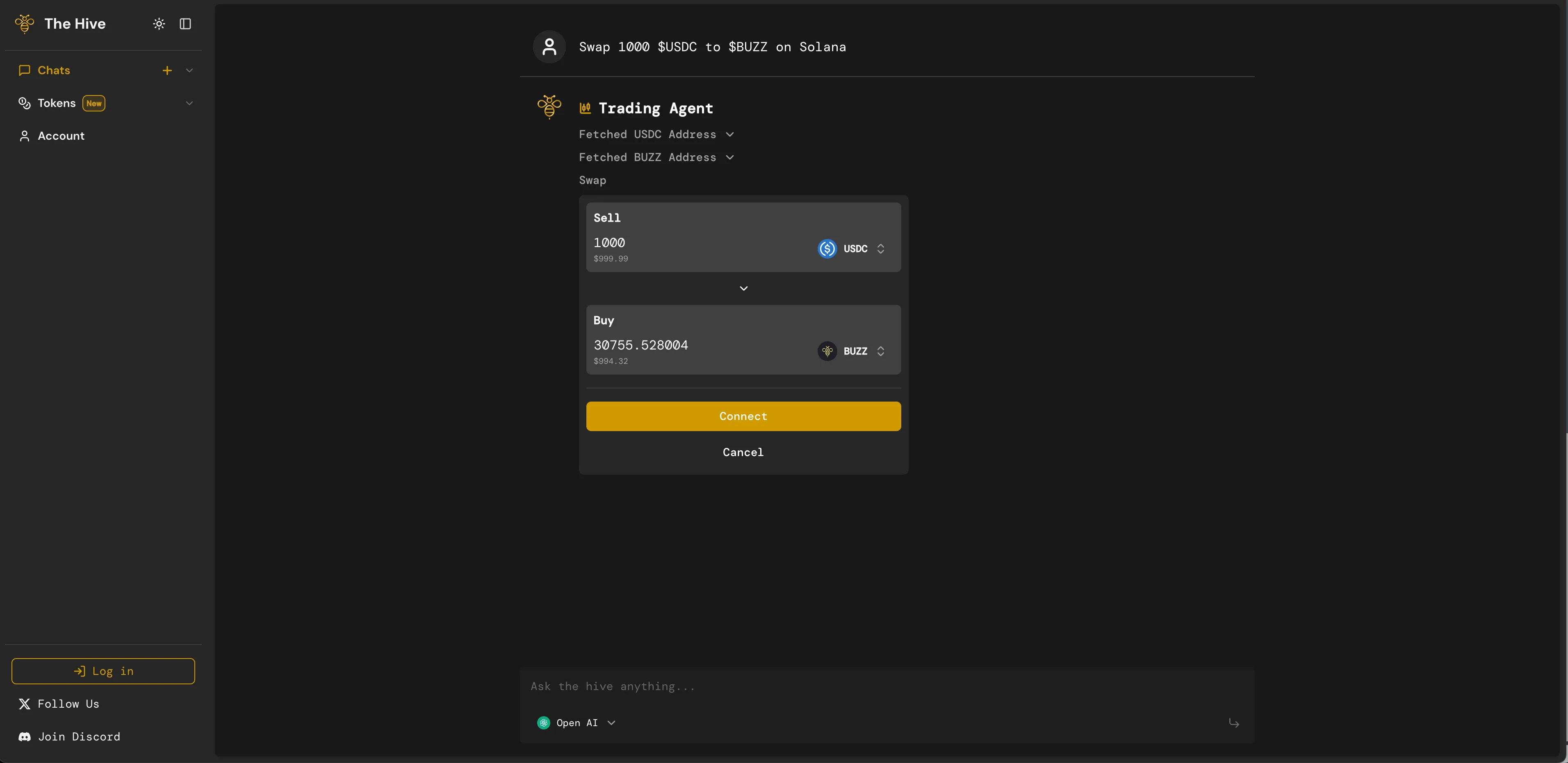 The primary way to use it is still through the chat box to express intents. For example, by entering "Swap 1000 $USDC to $BUZZ on Solana", The Hive will invoke the Trading Agent and pop up a plugin. By clicking "Connect", users can link their (Phantom) wallet, sign, and send the transaction.
