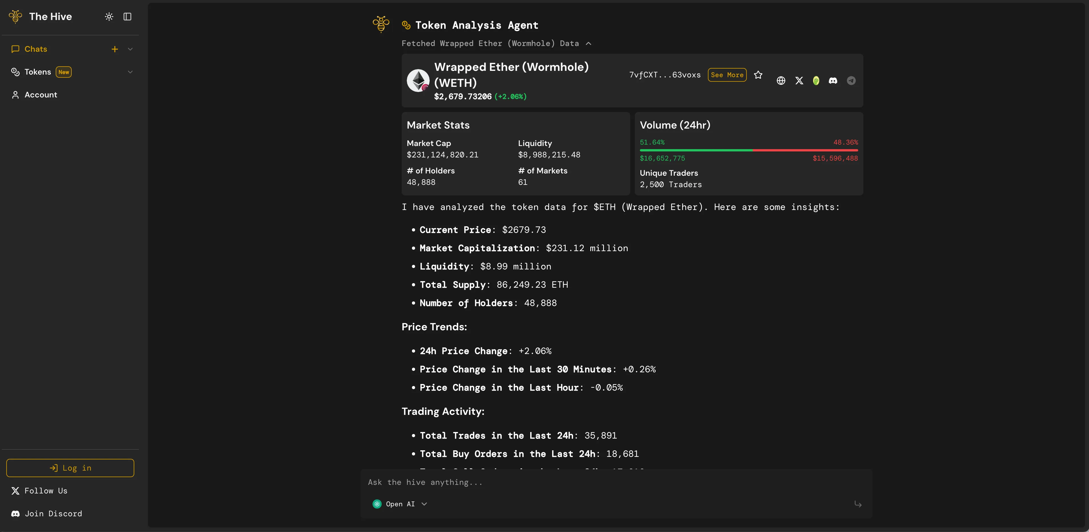 Users can also input "Analyze the trending of $ETH" to analyze the recent trend of Ethereum. The Hive will then call the Token Analysis Agent to display basic information about Ethereum, market conditions, price trends, transaction details, and active wallet activity, along with trading suggestions.
