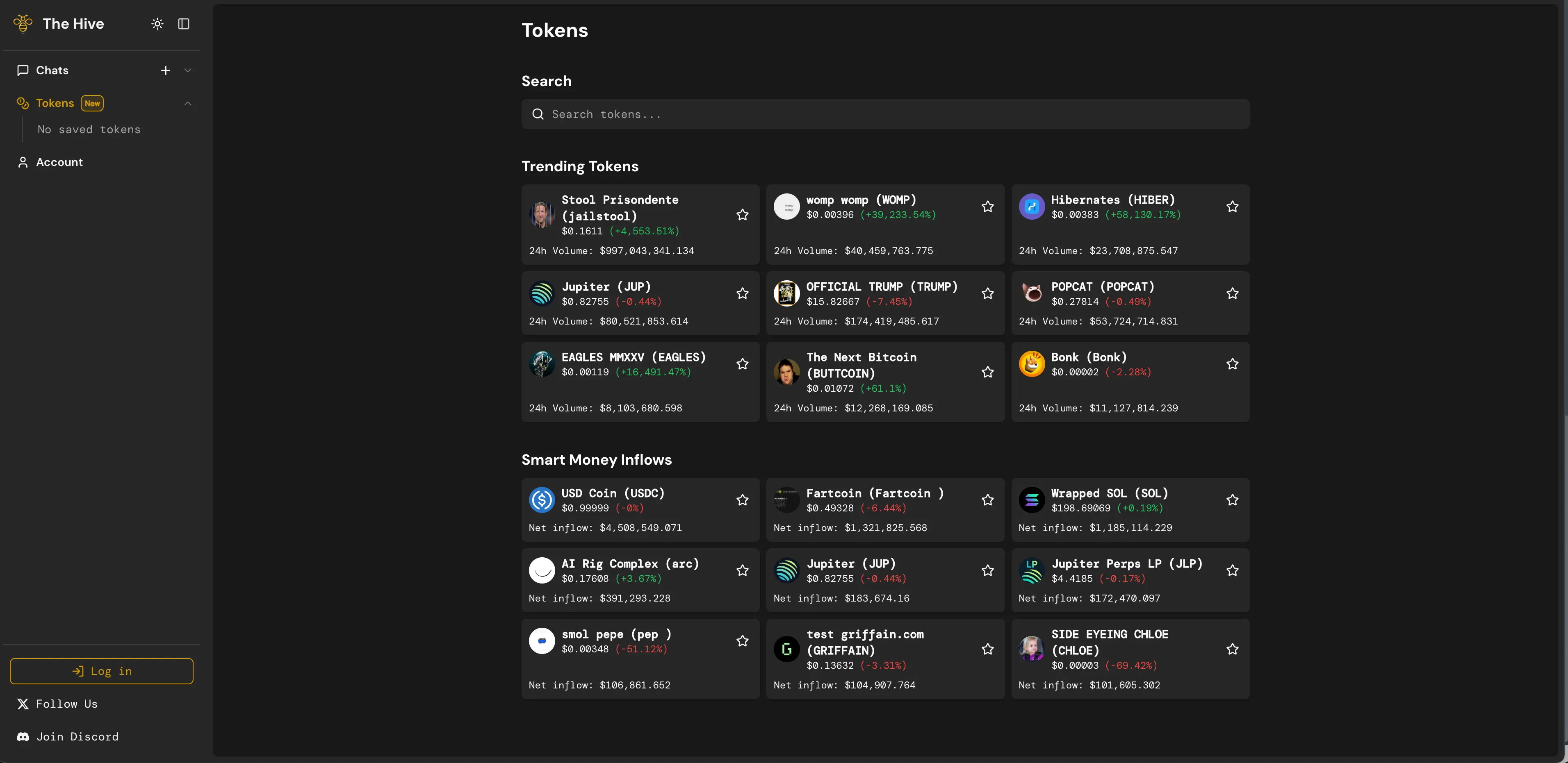 These are just a few simple examples; The Hive's functionality is far richer and continually evolving. For instance, the newly added Tokens page can showcase popular cryptocurrencies and the inflow of "smart money", which benefits users engaged in meme, pump.fun, and gmgn.