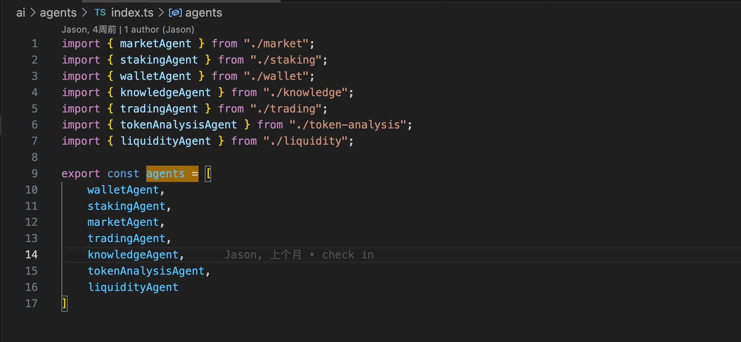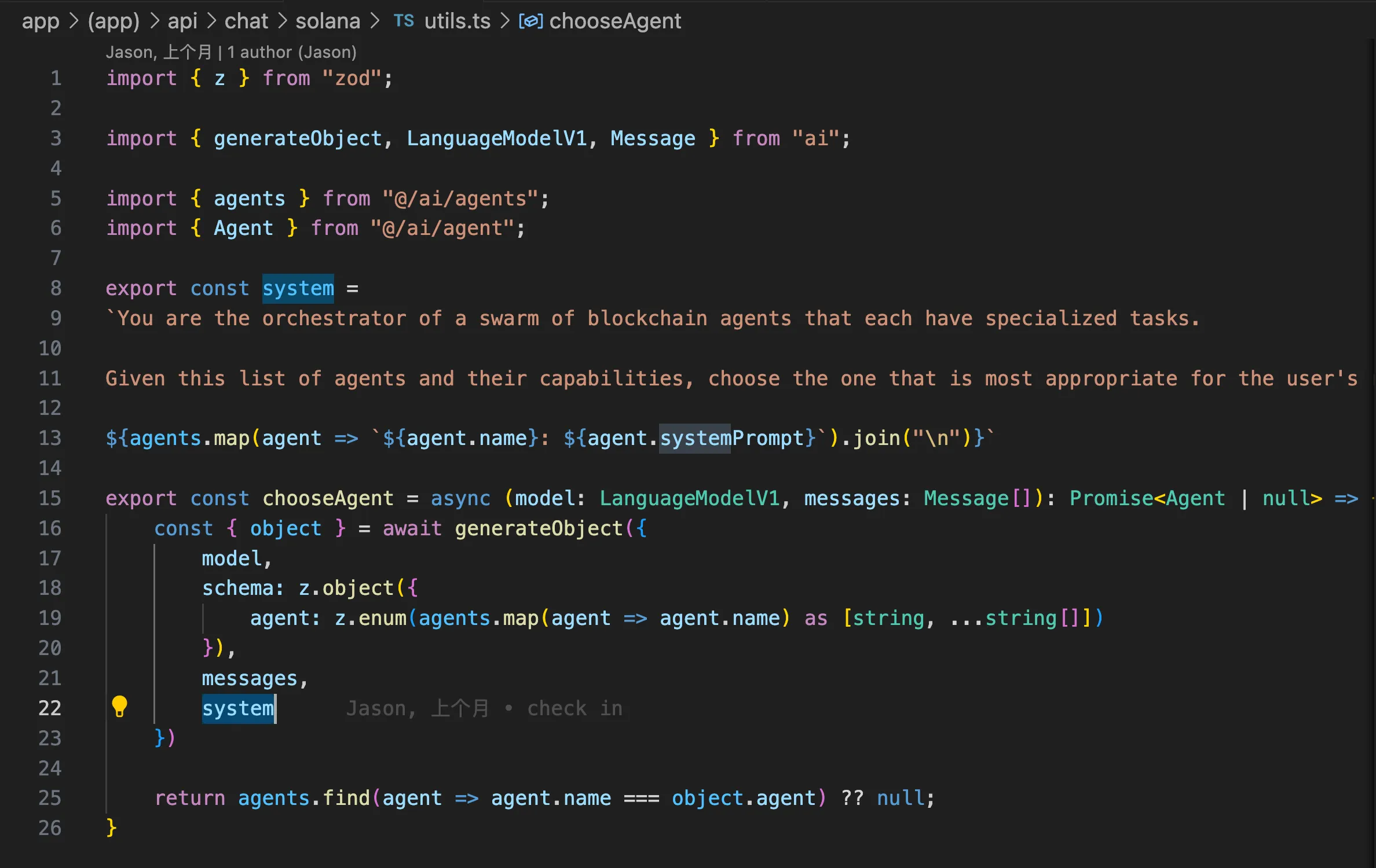 The core logic involves analyzing user input through LLM to identify suitable Agents. The author has defined prompts and toolsets for each Agent, and the AI Agent framework organizes the workflow among the Agents, ultimately returning the execution results to the user. The AI Agent framework is also implemented by the author (having incorporated the Solana Agent Kit but not actually using it, or possibly removing it in earlier versions).