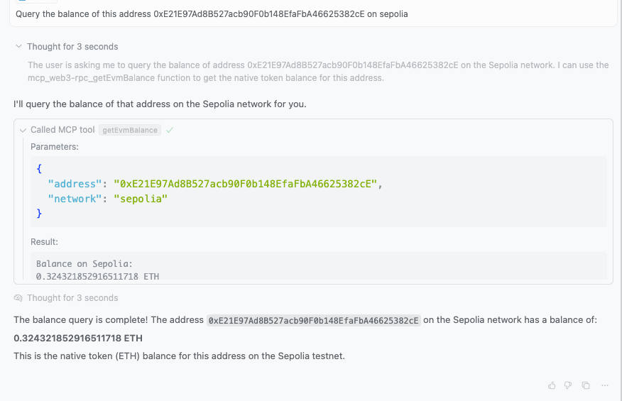 For example, "Query the balance of this address 0xE21E97Ad8B527acb90F0b148EfaFbA46625382cE on sepolia":