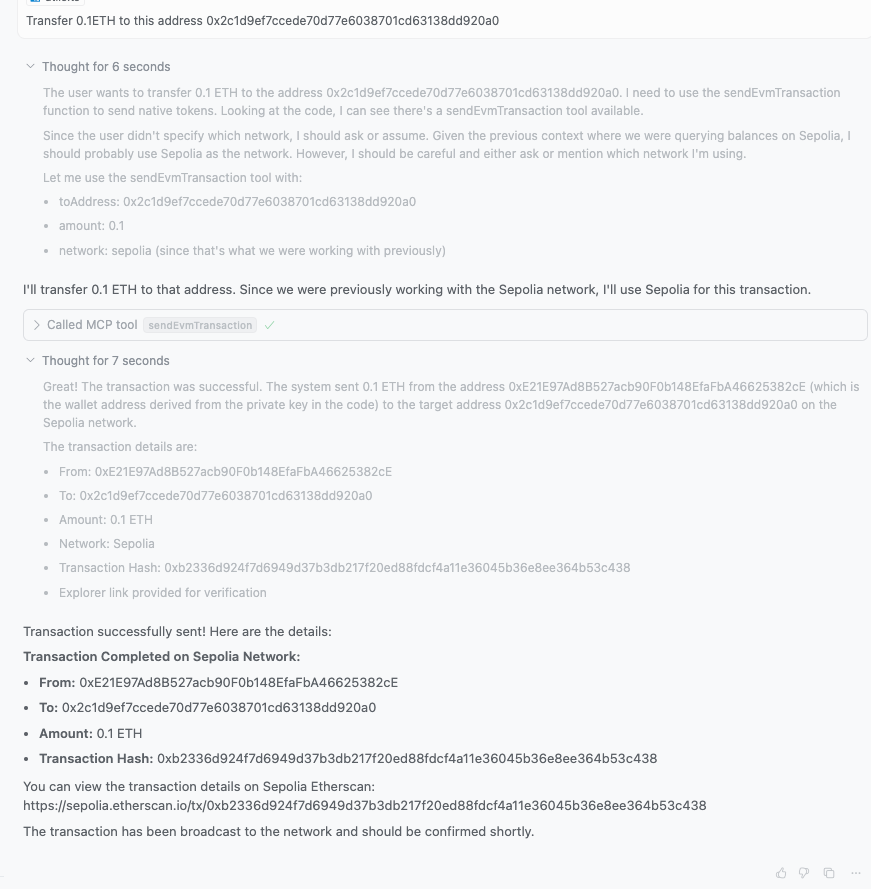 There is still a lot of room for our imagination. This article has explained the overall process. What else can we do later? For example, support multiple chains (Bitcoin, Solana, Tron), or connect to cross-chain. In the chat, we can exchange the USDT of my chain for another chain? The combination of Web3 and MCP opens up a new world full of possibilities for us. Whether it is DeFi protocol integration, NFT market operations, or complex cross-chain asset management, these can be achieved through simple conversations. Interested friends, come and try it!